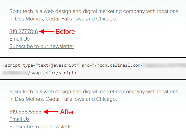 For example, our phone number is in the footer of our website. With the call tracking code placed, it would rewrite to a tracking number.